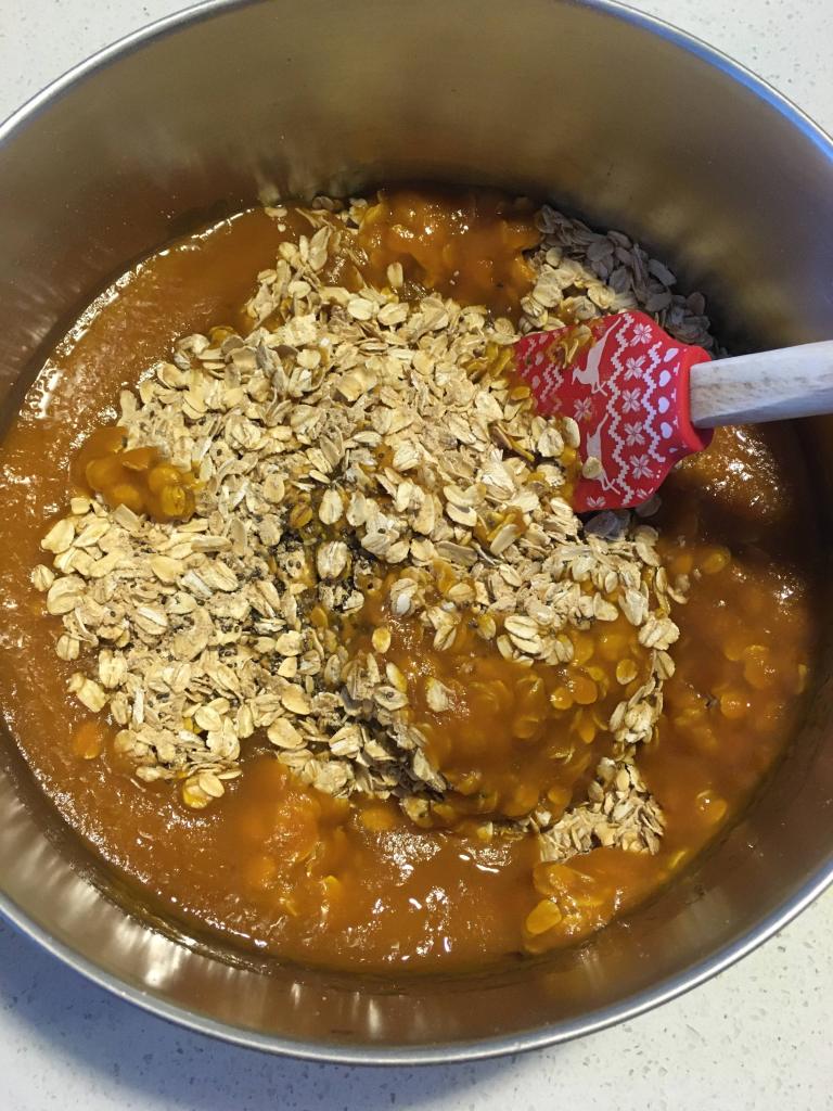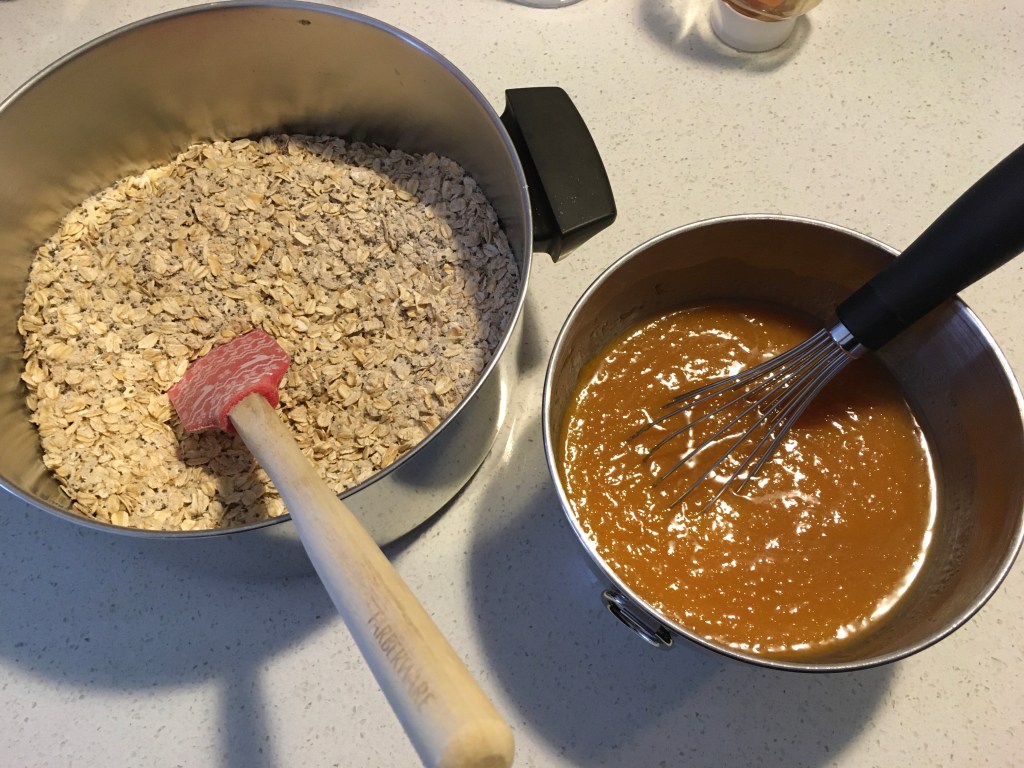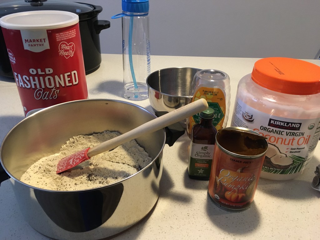 Preheat the oven to 350 degrees. Mix all of the dry ingredients together first (oats, chia seeds, spices, protein powder) and make sure it’s mixed well. In another mixing bowl put all of the wet ingredients together (pumpkin puree, coconut oil, honey, and vanilla) and make sure those are also well mixed.